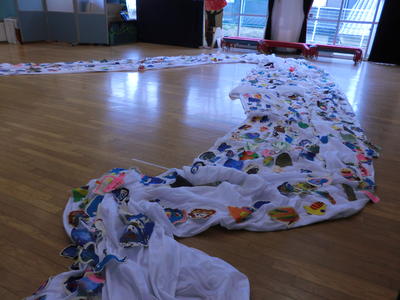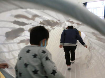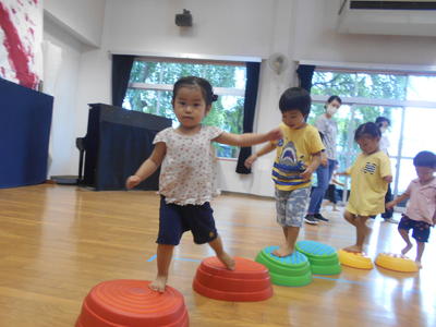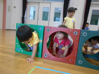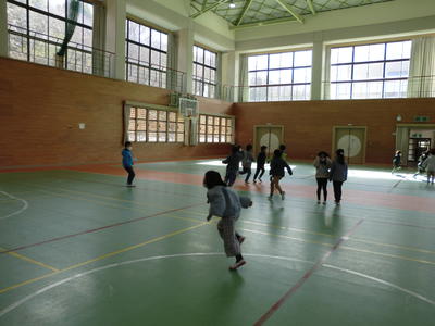 広い体育館では運動具を少しだけ出してもらって遊んだり、走ったりしました。一番、喜んでいたのは、校庭にある、遊具!!園とは違う遊具に大喜びでした。